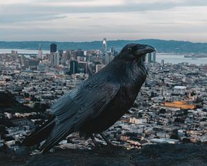 Raven perched on top of Twin Peaks hills in San Francisco, CA